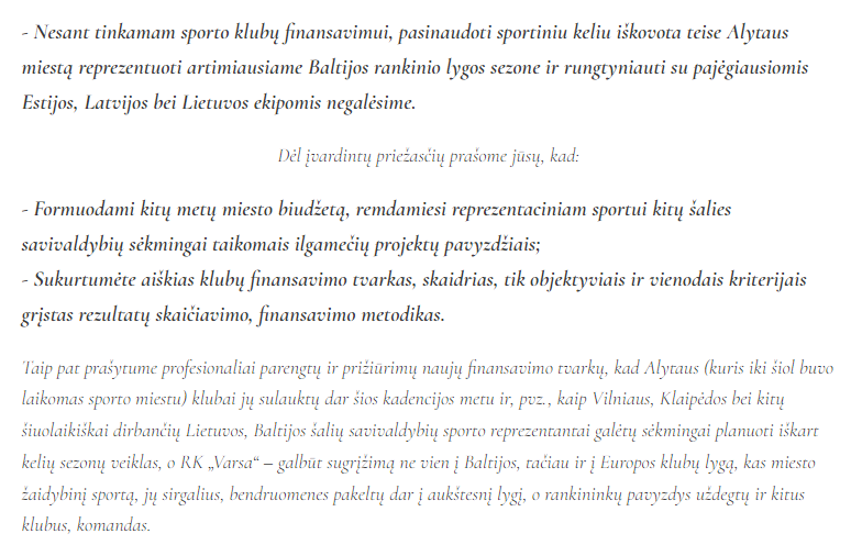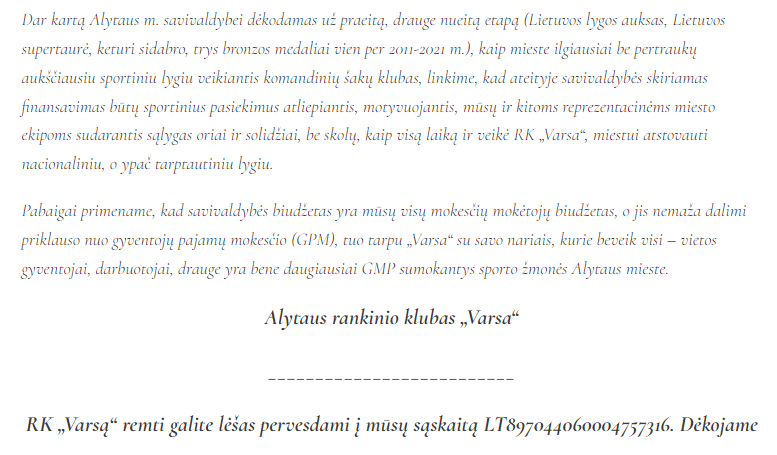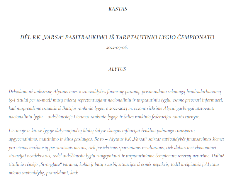 „Dėkodami už ankstesnę Alytaus miesto savivaldybės finansinę paramą, prisimindami sėkmingą bendradarbiavimą (9-i titulai per 10-metį) mūsų miestą reprezentuojant nacionaliniu ir tarptautiniu lygiu, esame priversti informuoti, kad nusprendėme trauktis iš Baltijos rankinio lygos, o 2022-2023 m. sezone sieksime Alytui garbingai atstovauti nacionaliniu lygiu – aukščiausioje Lietuvos rankinio lygoje ir šalies rankinio federacijos taurės turnyre“, – rašoma pranešime.