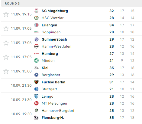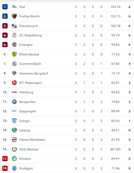 Pirmauja: „Kiel“, „Füchse“, „Flensburg“, „Magdeburg“ ir „Erlangen“ – po 6, … „Melsungen“ – 3.