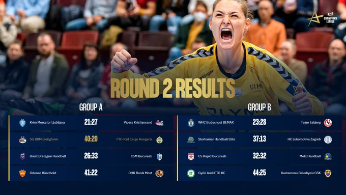 Čempionių lygoje per du turus po dvi pergales iškovojo keturios komandos. A grupėje pirmauja po 4 taškus surinkusios „Bietigheim“, nugalėtojos vardą ginanti Kristiansando „Vipers“ ir Bukarešto CSM. B grupės vienvaldė lyderė yra taip pat 4 taškus turinti Djoro „Audi“.