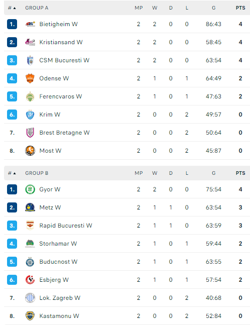 Čempionių lygoje per du turus po dvi pergales iškovojo keturios komandos. A grupėje pirmauja po 4 taškus surinkusios „Bietigheim“, nugalėtojos vardą ginanti Kristiansando „Vipers“ ir Bukarešto CSM. B grupės vienvaldė lyderė yra taip pat 4 taškus turinti Djoro „Audi“.