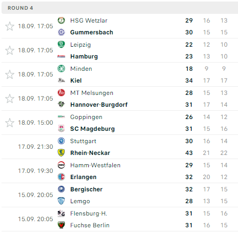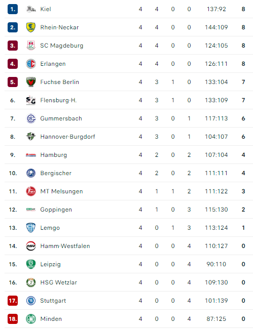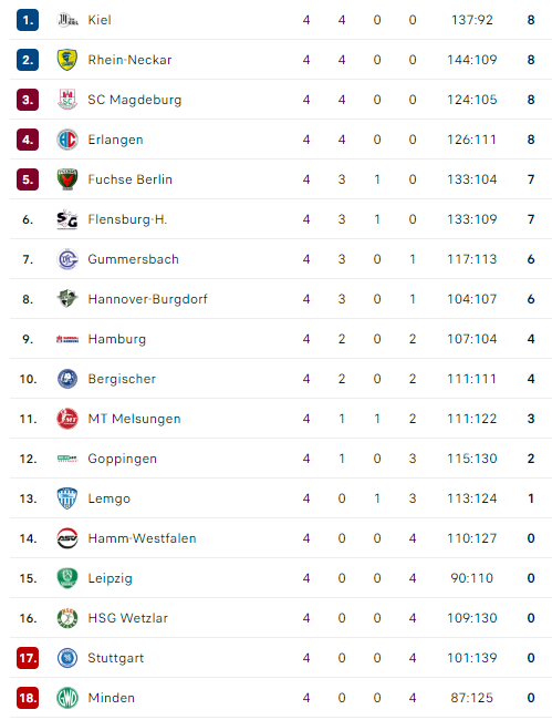 Pirmauja: „Kiel“, „Rhein-Neckar“, „Magdeburg“, „Erlangen“ – po 8, … „Melsungen“ – 3.