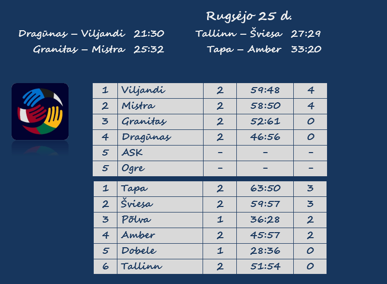 | Įmesti įvarčiai | 33 – Tapa (su Amber) | 36 – Põlva (su Dobele) |