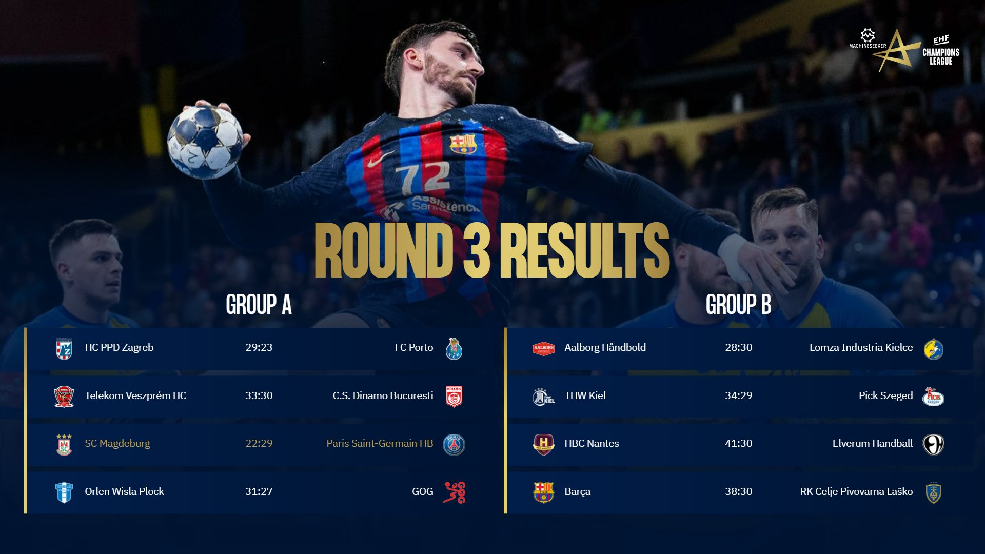 Vyrų rankinio Čempionų lygoje per tris turus nuostolių nepatyrė tik „Veszprém“ ir nugalėtojos vardą ginanti „Barcelona“. Šiso komandos iškovojo trečiąsias pergales ir tapo grupių lyderėmis.