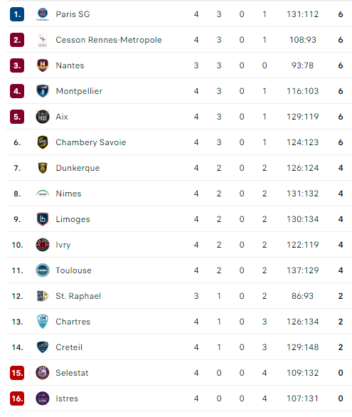Pirmauja: „Nantes“, PSG, „Cesson“, „Montpellier“, „Aix“, „Chambery“ – po 6, … „Istres“ – 0.