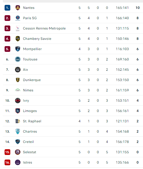 Pirmauja: „Nantes“ – 10, PSG, „Cesson“, „Chambery“ – po 8, „Montpellier“, „Toulouse“, „Aix“, „Dunkerque“, „Nîmes“ – po 6, … „Istres“ – 0.