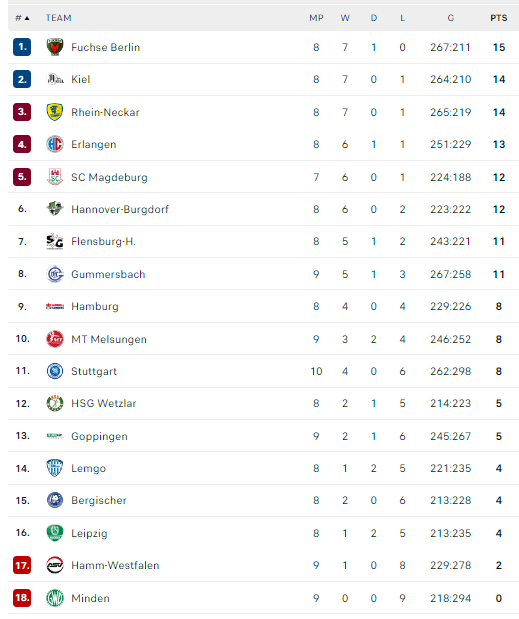 Pirmauja: „Füchse“ – 15, „Kiel“, „Rhein-Neckar“, – po 14, „Erlangen“ – 13, „Magdeburg“, „Hannover“ – po 12, … „Melsungen“ – 8.