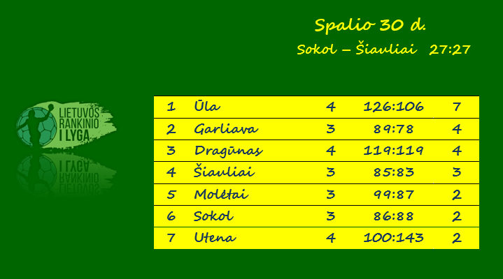 Šalčininkų „Sokol“ – „Šiauliai“ 27:27 (12:13). Girdzijevskis 7, Gaidukas 6, Gureckis 5 / Butkus 13, Saliamoris 6, Budraitis 5.