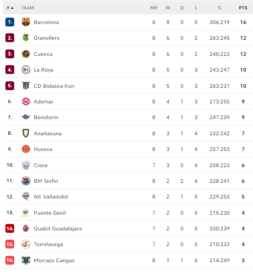 Pirmauja: „Barcelona“ – 16, „Fraikin“, „Cuenca“ – po 12, „Bidasoa“, „La Rioja“ – 10, „Ademar“, „Benidorm“ – po 9.