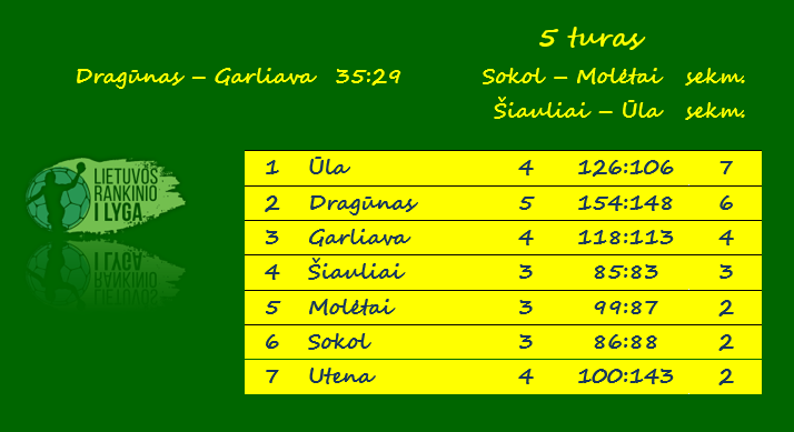 Lietuvos vyrų rankinio pirmojoje lygoje penktadienį buvo sužaistos pirmos penktojo turo rungtynės. Jose Klaipėdos „Dragūno“ dubleriai namie nugalėjo „Garliavą“ 35:29.