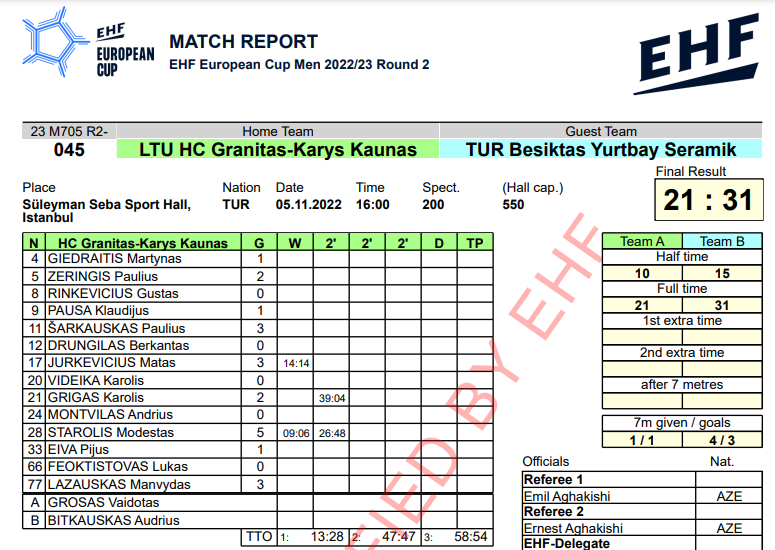 Šeštadienį Kauno komanda 5-ąją min. pirmavo 3:2, bet po to net 10 minučių neįmetė į šeimininkų vartus ir paleido „Beşiktaş“ į priekį 3:8. Pirmojo kėlinio pabaigoje skirtumas beveik nesikeitė, tačiau po pertraukos „Granitas“ pradėjo artėti ir 36-ąją min. atsiliko vos vienu įvarčiu 15:16.