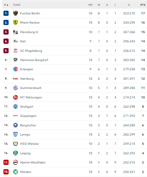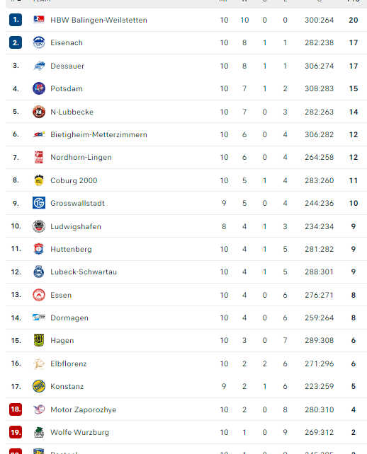 Pirmauja: „Balingen“ – 20, „Eisenach“, „Dessau“ – po 17, „Potsdam“ – 15, „N-Lübbecke“ – 14, … „Grosswallstadt“ – 10, … „Elbflorenz“ – 6, … „Motor“ – 4.