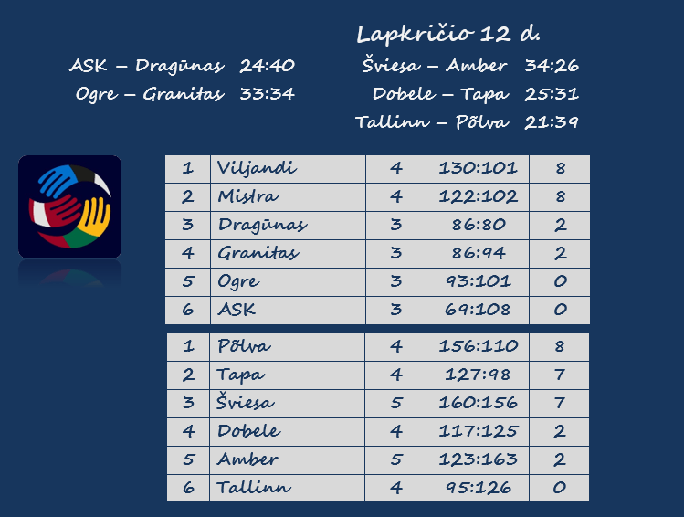 | Baudiniai | 6 – Bliuvas, Šviesa (su Amber), Citko, Amber (su Šviesa) | 6 – Sillaste, Põlva (su Dobele), Bliuvas, Šviesa (su Amber), Citko, Amber (su Šviesa) |