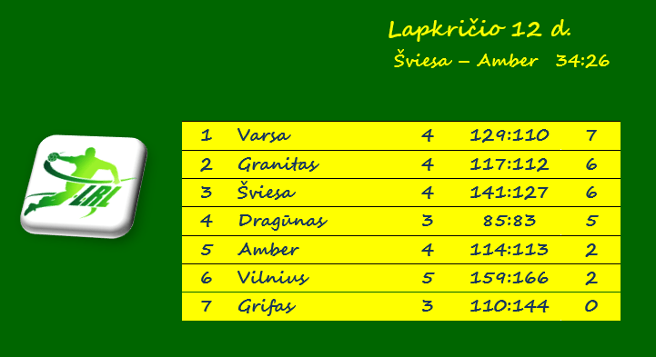 | Įvarčiai | 9 – Bliuvas, Šviesa (su Amber), Citko, Amber (su Šviesa) | 15 – Drevinskas, Vilnius (Šviesa) |