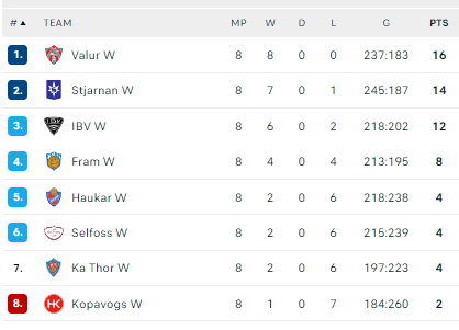 Pirmauja: „Valur“ – 16, „Stjarnan“ – 14, IBV – 12, … „Selfoss“ – 4.