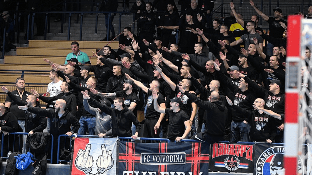 Veidus slėpę serbai dar prieš rungtynes ėmė priekabiauti prie vietos sirgalių ir grasino fotografams, kurie norėjo nufotografuoti svečių tribūną.