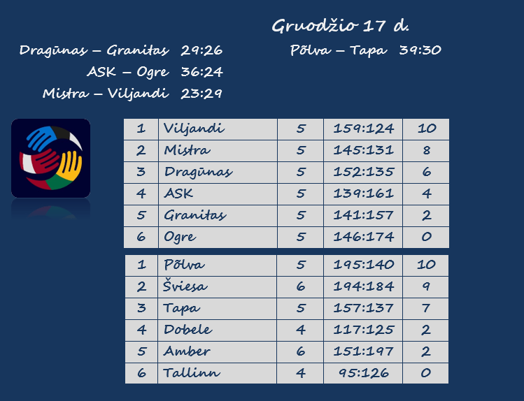 Estijos čempionė „Serviti“ susigrąžino pirmąją vietą šeštadienį nugalėjusi „Tapa“ rankininkus 39:30. A grupės lyderių rungtynėse Baltijos lygos čempiono vardą ginantis „Viljandi“ išvykoje įveikė Rasiku „Mistra“ komandą 29:23.
