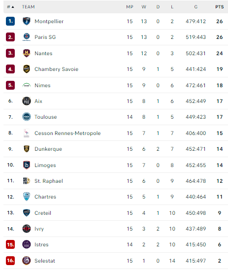 Pirmauja: „Montpellier“, PSG – po 26, „Nantes“ – 24, „Chambery“ – 19, „Nîmes“ – 18, „Aix“, „Toulouse“ – po 17, … „Istres“ – 6.