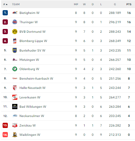 Pirmauja: „Bietigheim“, „Thuringer“ – po 14, „Borussia“ – 14, „Blomberg“ – 12, … „Bayer“ – 7.