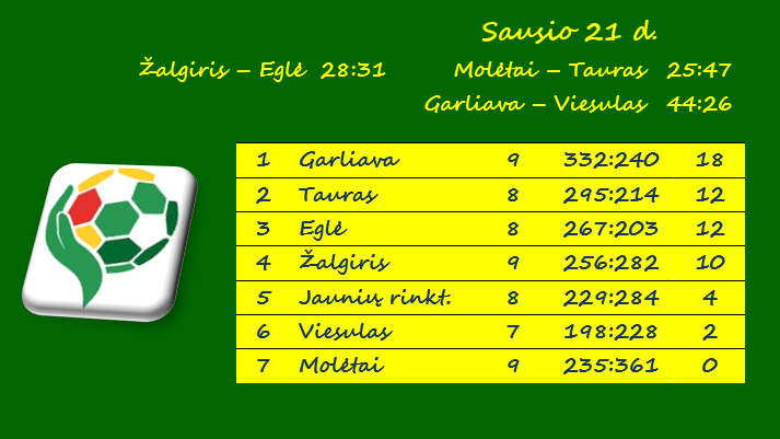 Kitose dvejose šeštadienį žaistose rungtynėse intrigos nebuvo. Turnyro lyderė „Garliava“ namie nugalėjo Klaipėdos „Viesulą“ 44:26 (23:12), Vilniaus „Tauras“ išvykoje įveikė „Molėtus“ 47:25 (25:11).