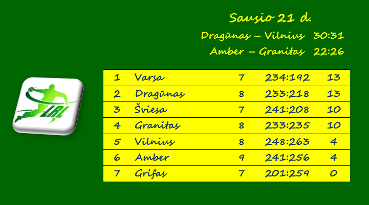 | Įmesti įvarčiai | 31 – Vilnius (su Dragūnu) | 43 – Šviesa (su Grifu) |