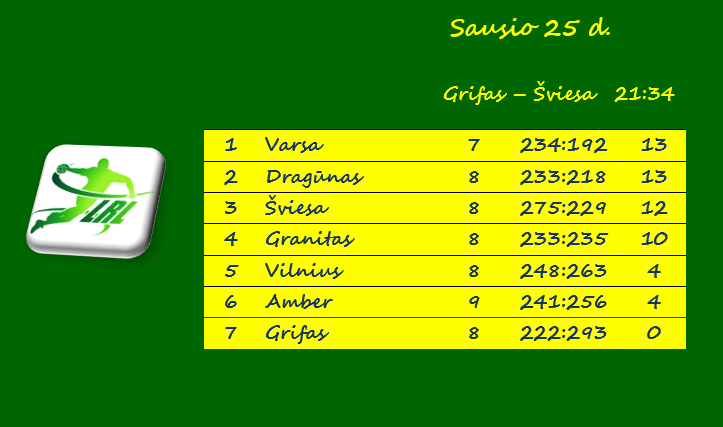 | Įvarčiai | 8 – Ugianskis, Šviesa (su Grifu) | 15 – Drevinskas, Vilnius (su Šviesa) |
