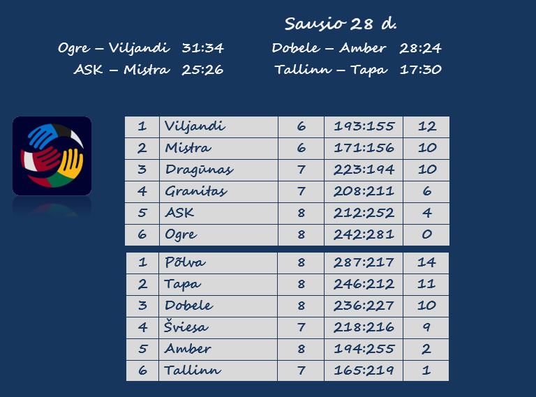 Kitose trejose rungtynėse šeštadienį pergales šventė išvykose žaidusios Estijos komandos. „Tapa“ sutriuškino „Tallinn“ 30:17, čempiono vardą ginantis „Viljandi“ įveikė „Ogre“ 34:31, Rasiku „Mistra“ palaužė Rygos ASK 26:25.