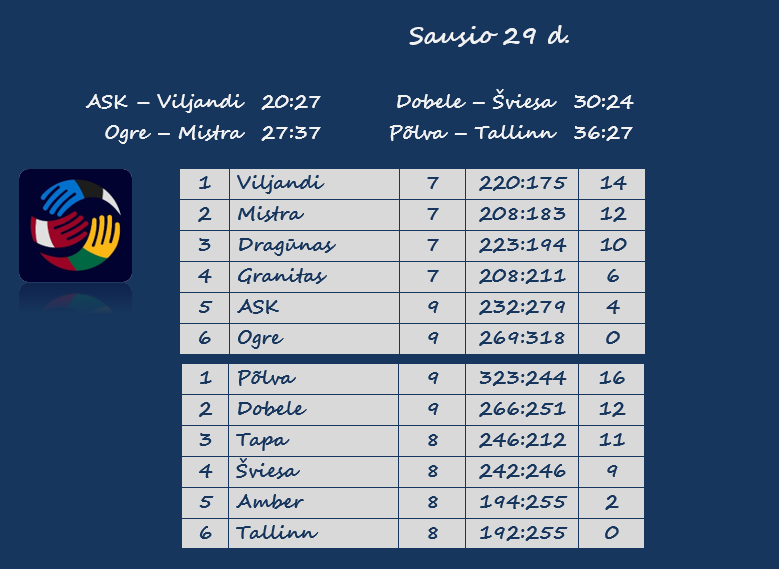 Po šio savaitgalio rungtynių paaiškėjo visos aštuonios komandos, kurios žais atkrintamosiose varžybose. A grupėje keturias pirmąsias vietas užsitikrino Baltijos lygos nugalėtojo vardą ginantis „Viljandi“, Rasiku „Mistra“, Klaipėdos „Dragūnas“ ir Kauno „Granitas“, B grupėje – Pylvos „Serviti“, Duobelės „Tenax“, „Tapa“ ir Vilniaus „Šviesa“.