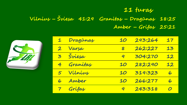 Lietuvos vyrų rankinio lygoje šeštadienį vyko 11-ojo turo rungtynės. Įspūdingiausiai pergalę pasiekė „Vilnius“, Molėtuose surengtame sostinės derbyje sutriuškinęs be kelių pagrindinių rankininkų žaidusią Vilniaus „Šviesą“ 41:29 (18:16).