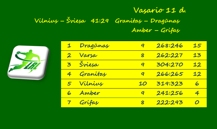 „Emigracijoje“ vykusiame Vilniaus derbyje įspūdingą pergalę pasiekė pagreitį įgavę „Vilniaus“ rankininkai. Jie šeštadienį Molėtuose vykusiose Lietuvos rankinio lygos rungtynėse sutriuškino šalies čempionės vardą ginančią ir prieš savaitę Lietuvos taurę iškovojusią „Šviesą“ 41:29 (18:16).