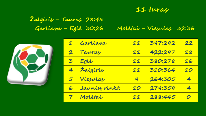 Iki reguliariojo sezono pabaigos likus vienam turui visas 11 rungtynių laimėjusi „Garliava“ turi 22 taškus. „Tauras“ surinko 18 taškų, „Eglė“ – 16.