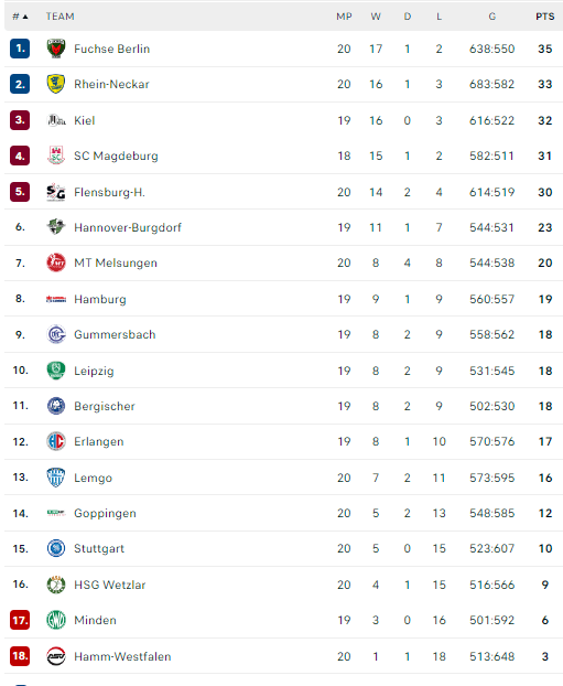 Pirmauja: „Füchse“ – 35, „Rhein-Neckar“ – 33, „Kiel“ – 32, „Magdeburg“ – 31, „Flensburg“ – 30, „Hannover“ – 23, „Melsungen“ – 20, … „Stuttgart“ – 10.