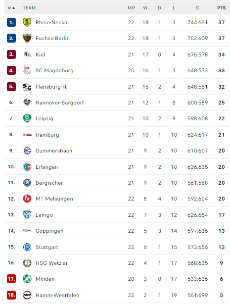 Paskutinėje sezono dalyje kova dėl čempiono vardo bus labai arši. Į pirmąją vietą taikosi net penkios komandos. Po 22 turų pirmąją vietą dalijasi po 37 taškus iškovoję Manhaimo „Rhein-Neckar Löwen“ ir „Füchse“, tačiau persekiotojai žaidė mažiau rungtynių. „Kiel“ sąskaitoje yra 34 taškai (ir vienerios nukeltos rungtynės), „Magdeburg“ – 33 (dvejos nukeltos rungtynės), „Flernsburg-Handewitt“ – 32 (vienerios nukeltos rungtynės).
