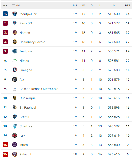Po 19-ojo turo vienvaldžiu LNH lyderiu tapo „Montpellier“ klubas, iškovojęs 34 taškus. Po 32 taškus turi PSG ir „Nantes“. Iki turnyro pabaigos liko 11 turų, tad pavasarį įmanomi įvairiausi siužeto posūkiai.