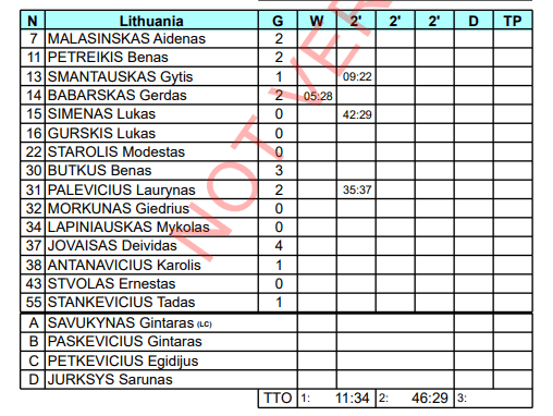 Lietuva: Jovaišas 4, Butkus 3, Malašinskas 2, Petreikis 2, G.Babarskas 2, Palevičius 2, Šmantauskas 1, Antanavičius 1, Stankevičius 1.