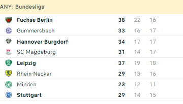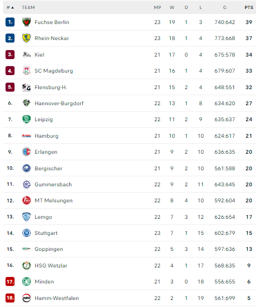Pirmauja: „Füchse“ – 39, „Rhein-Neckar“ – 37, „Kiel“ – 34, „Magdeburg“ – 33, „Flensburg“ – 32, „Hannover“ – 27, „Leipzig“ – 24, … „Melsungen“ – 20, … „Stuttgart“ – 15.