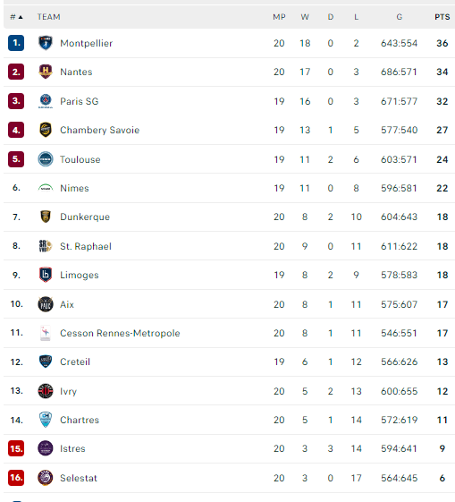 Pirmauja: „Montpellier“ – 36, „Nantes“ – 34, PSG – 32, „Chambery“ – 27, „Toulouse“ – 24, … „Aix“ – 17, … „Istres“ – 9.