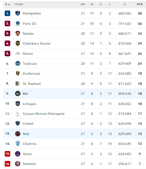 Pirmauja: „Montpellier“ – 38, PSG – 36, „Nantes“ – 34, „Chambery“ – 29, „Nimes“ – 26, „Toulouse“ – 24, … „Aix“ – 18, … „Istres“ – 9.