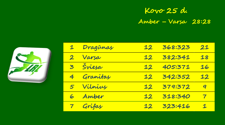 Lietuvos vyrų rankinio lygoje šeštadienį įvyko paskutinės reguliariojo sezono rungtynės. Jose Vilniaus „Amber“ ir Alytais „Varsa“ sužaidė lygiosiomis 28:28 (14:13).