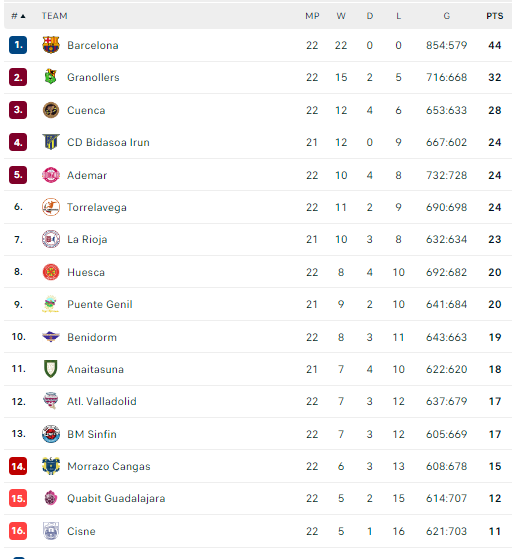 Pirmauja: „Barcelona“ – 44, „Fraikin“ – 32, „Cuenca“ – 28, „Bidasoa“, „Ademar“, „Torrelavega“ – po 24, „La Rioja“ – 23, … „Benidorm“ – 19.