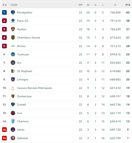 Pirmauja: „Montpellier“ – 40, PSG – 38, „Nantes“ – 37, „Chambery“ – 31, „Nimes“ – 28, „Toulouse“ – 25, „Aix“, „St.Raphael“, „Limoges“ – po 20, … „Istres“ – 9.