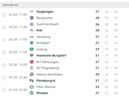 Pirmauja: „Kiel“ – 40, „Füchse“ – 39, „Magdeburg“ – 38, „Flensburg“ – 37, „Rhein-Neckar“ – 37, … „Melsungen“ – 24, … „Stuttgart“ – 16.