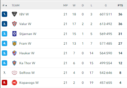 Galutinė reguliariojo sezono lentelė: IBV – 36, „Valur“ – 36, „Stjarnan“ – 31, „Fram“ – 27, „Haukar“ – 14, „Thor“ – 12, „Selfoss“ – 8, HK – 4.