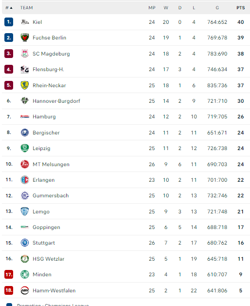 Pirmauja: „Kiel“ – 40, „Füchse“ – 39, „Magdeburg“ – 38, „Flensburg“ – 37, „Rhein-Neckar“ – 37, … „Melsungen“ – 24, … „Stuttgart“ – 16.