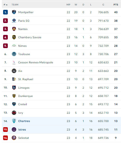 Pirmauja: „Montpellier“ – 40, PSG – 38, „Nantes“ – 37, „Chambery“ – 33, … „Aix“ – 20, … „Istres“ – 11.