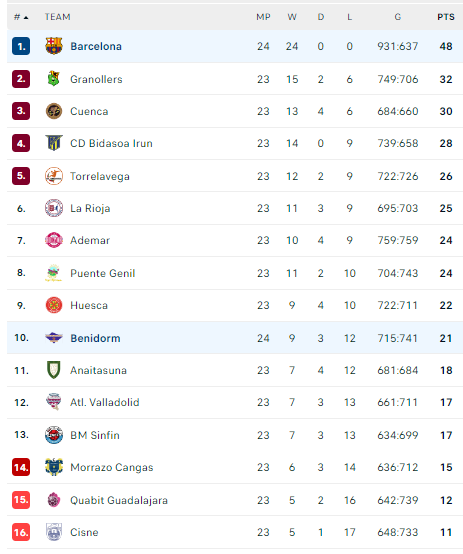 Pirmauja: „Barcelona“ – 48, „Fraikin“ – 32, „Cuenca“ – 30, „Bidasoa“ – 28, … „Ademar“ – 24, … „Benidorm“ – 21.