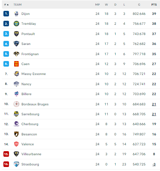 Pirmauja: „Dijon“ – 39, „Tremblay“ – 38, „Pontault“ – 37, „Saran“ – 36, „Frontignan“ – 35, … „Bruges“ – 21.