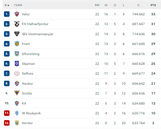 Galutinė reguliariojo sezono lentelė: „Valur“ – 33, FH – 31, IBV – 30, Reikjaviko „Fram“ – 29, „Afturelding“ – 29, „Stjarnan“ – 25, „Selfoss“ – 24, „Haukar“ – 21, Seltjarnarneso „Grotta“ – 17, Akureirio KA – 13, IR – 10, Isafjorduro „Hordur“ – 2.