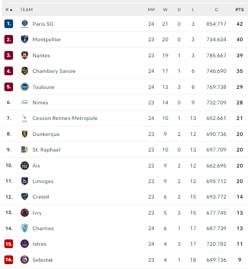 Pirmauja: PSG – 42, „Montpellier“ – 40, „Nantes“ – 39, „Chambery“ – 35, … „Aix“ – 20, … „Istres“ – 11.