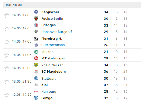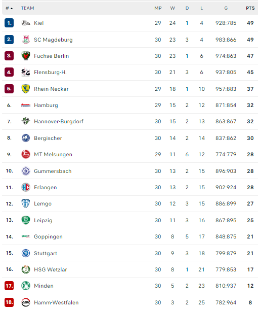 Pirmauja: „Kiel“, „Magdeburg“ – po 49, „Füchse“ – 47, „Flensburg“ – 45, „Rhein-Neckar“ – 37, … „Melsungen“ – 28, … „Stuttgart“ – 21.