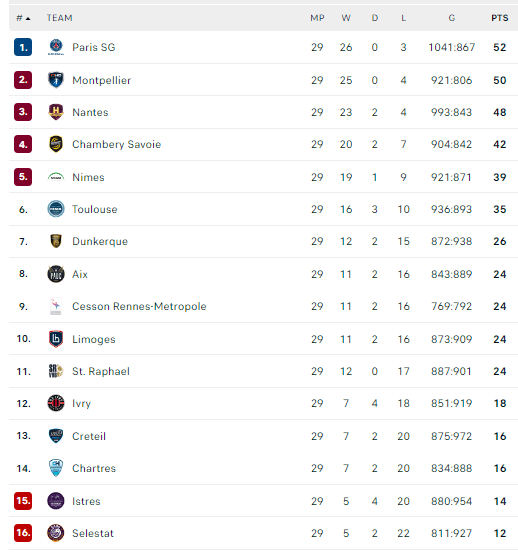 Pirmauja: PSG – 52, „Montpellier“ – 50, „Nantes“ – 48, „Chambery“ – 42, „Nimes“ – 39, „Toulouse“ – 35, „Dunkerque“ – 26, „Aix“, „Cesson“, „Limoges“, „St.Raphael“ – po 24.